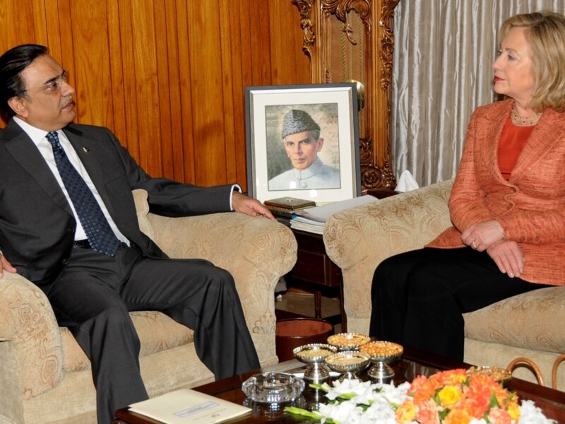 پاکستان: د امریکا د بهرنیو چارو وزیره هیلري کلنټن له پاکستاني ولسمشر اصف علي زرداري سره. د دواړو هېوادونو اړیکي د اسامه بن لادن تر وژنې وروسته کړکېچن شول. او تر هغې وروسته بیا د روان کال د مې د میاشتې په پای کې مېرمن کلنټ پاکستان ته لاړه- د ۲۰۱۱ز کال د مې ۲۷مه