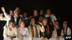 د پاکستانيو مطبوعاتو له مخې د پاکستان واکمن ګوند «مسلم لیګ ن» کارکنانو د تحريک انصاف د مشر پر کنټېنر کاڼي اورولي دي.
