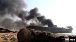 (د ګډانۍ دغه سیمې ته سمندري بېړۍ (جهازونه) کباړولو او ماتولو ته وروړل کېږي۔ په ژوبلو کې هغه مزدوران ول چې بېړۍ یې ماتوله او دغه مهال یو ګېس سیلېنډر پرې چاودېدلی دی، د سمندري ځواک اوروژونکي د اور په وژلو بوخت دي.)